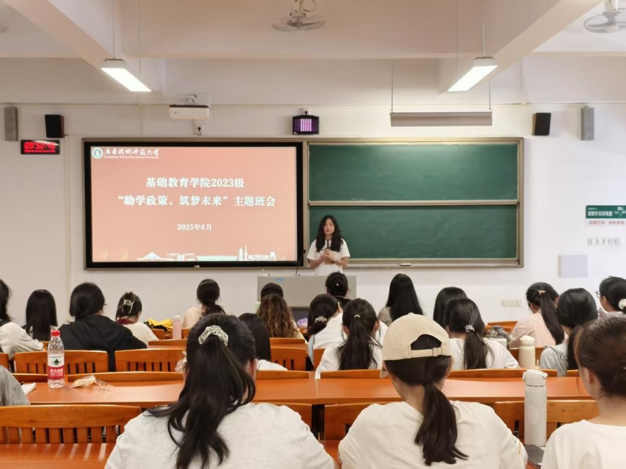 根据《教育部财政部关于进一步加强学生资助政策宣传工作的通知》(教财〔2015〕8号)文件要求,为扩大资助宣传覆盖面、提升学生资助工作的精准度与育人实效,william威廉中文官网于6月12日在唯实楼108开展“助学政策,筑梦未来”主题班会。本次活动2023级小学教育专业全体本科生参与,2023级助学委员谢思佳担任主持人。
