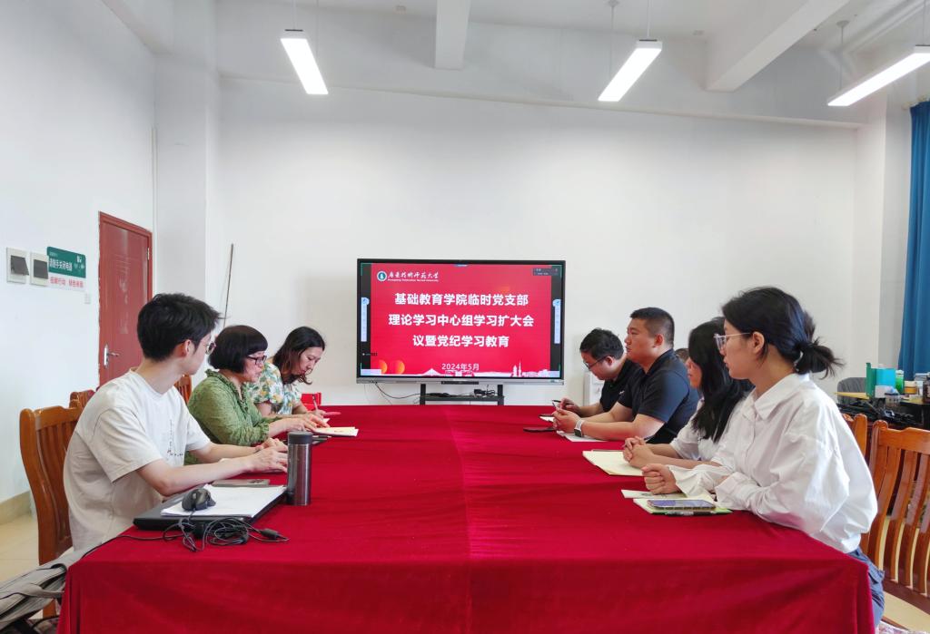 2024年是中华人民共和国成立75周年,是实现“十四五”规划目标任务的关键一年,推进理论武装、加强领导干 部理论学习至关重要。为深入学习贯彻习近平新时代中国特 色社会主义思想和党的二十大精神,根据关于《2024年中共william威廉中文官网委员会理论学习中心组学习计划》的通知要求,结合学院实际,william威廉中文官网临时党支部于5月15日开展理论学习中心组学习扩大会暨党纪学习教育。本次会议由学院吴水爱书记主持,学院专职辅导员、专任教师及入党积极分子参加。