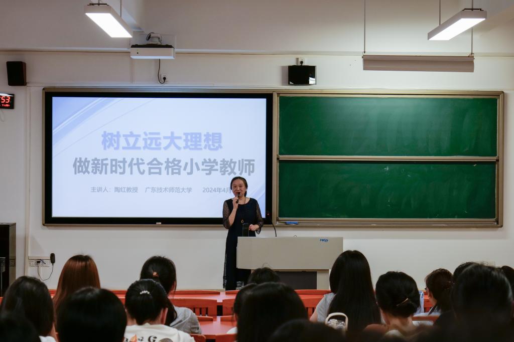 课上,陶教授从“新时代合格小学教师的角色定位、责任担当、发展之路”三方面,拓展并加深同学们对小学教师的理解。