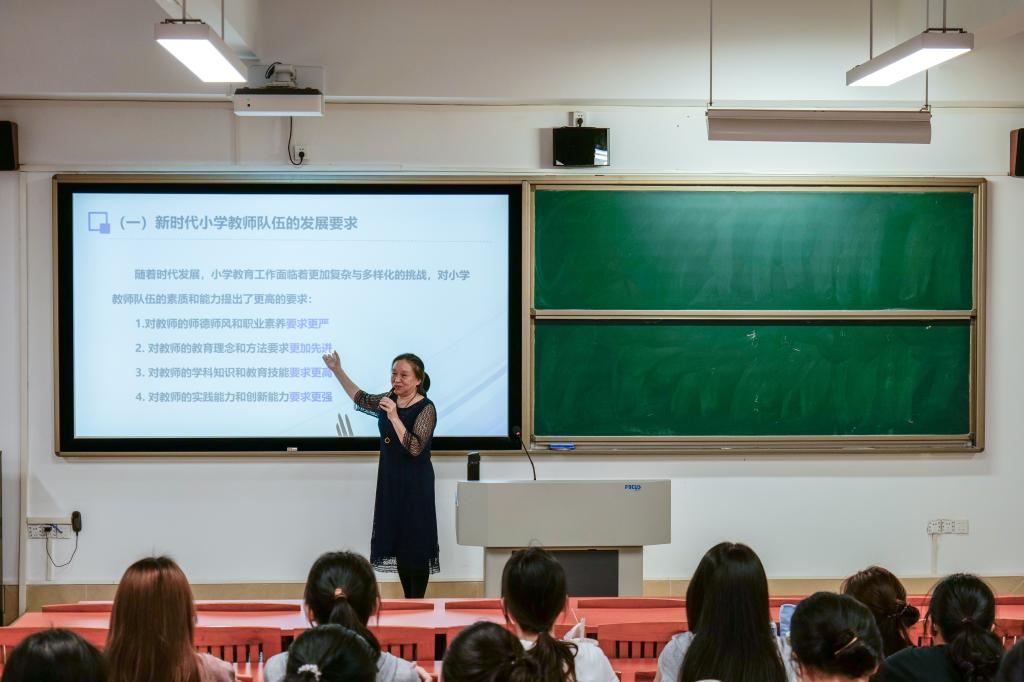 “当前,小学教育工作面临来自学生多样化需求、教育科技的数字化、家校社协同育人等诸多挑战,这对小学教师队伍的素质和能力提出了更高的要求,新时代的小学教师要坚定理想信念、陶冶道德情操、涵养扎实学识、勤修仁爱之心。”陶教授以感动中国人物,“扁担校长”张玉滚为例,讲述其躬耕教育沃土,诠释师德内涵的事迹,引导同学们认识到教师的光荣使命在于立德树人,培养社会主义合格建设者和可靠接班人,新时代小学教师需扮演好知识的传播者、学生的引路人、社会的代言人三重角色。