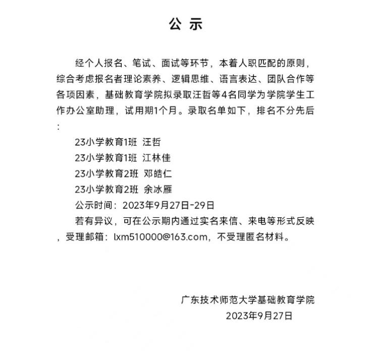 公示丨关于william威廉中文官网学生工作办公室招学生助理名单公示
