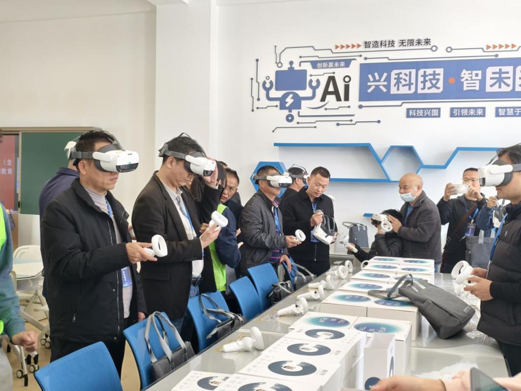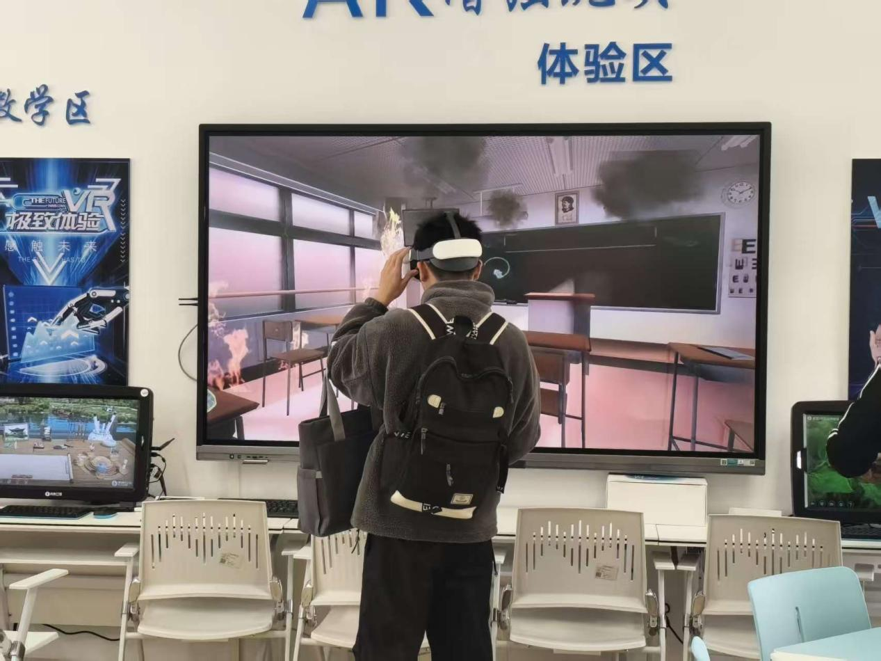 值得一提的是,在虚拟仿真实训室,参会人员还佩戴VR 眼镜,沉浸式体验校园火灾逃生资源,逼真的场景还原、交互式的逃生操作流程,让大家身临其境地掌握火灾逃生的处理方法和技巧。