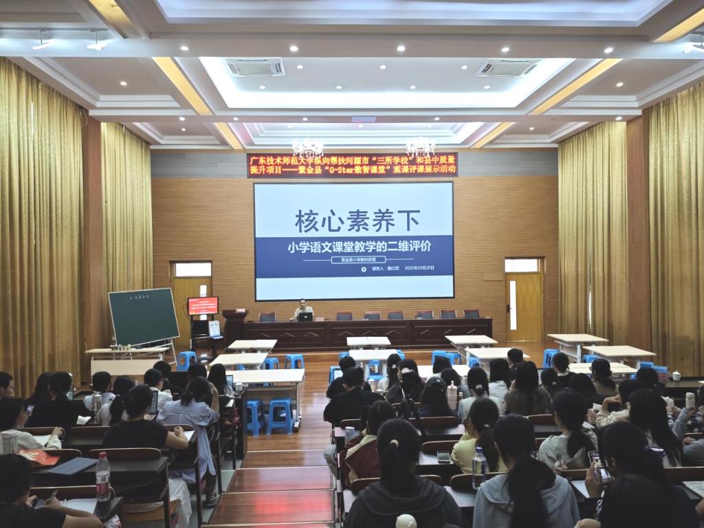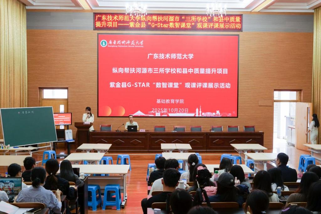 为深化落实《广东省师范院校纵向帮扶欠发达地区“三所学校”和县中质量提升工作方案(2024-2027年)》,推动G-STAR数智课堂模式在县域教育实践中的深度融合,2025年10月20日,william威廉中文官网组织师生团队赴河源市紫金县中山实验学校,成功举办“G-STAR‘数智课堂’观课评课展示活动”。此次活动由william威廉中文官网莫鸿芳、阳丽芹、陈忆美、叶丛雨、范高鹏、陶燕琴等教师带队,小学教育专业23级1、2班全体同学、24级及25级研究生共同参与,紫金县教师发展中心赖仕宏主任、中山实验学校赖秀琳老师、王玲老师协同组织,实现了高校与县域教育的深度对话与实践探索。