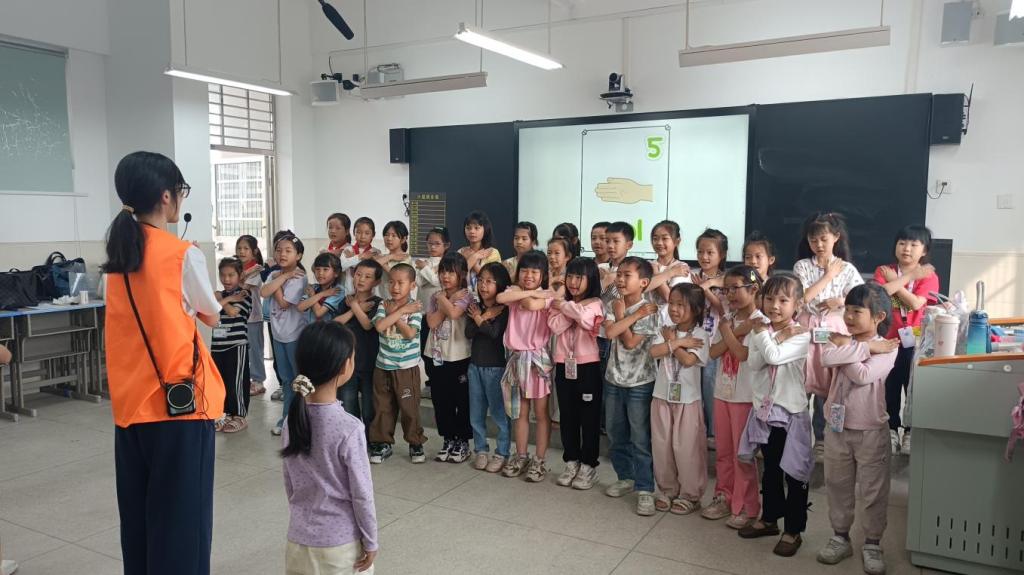 结课课堂以《音乐之声》插曲《Do-Re-Mi之歌》为导入,带领学生从回顾《海底音乐会》的“Do、Mi、Sol”三个手势,到逐一攻克八个科尔文手势。志愿团队通过“红花奖励+即时反馈”机制调动课堂活力,学生们的红花代表着他们课堂中的良好表现,而这也成为八周教学的鲜活注脚。结课合影时,孩子们举着贴满红花的手册追问:“秋天能教我们唱《月光光》吗?”——这本写满红花的成长手册,将成为新学期音乐课的通行证。