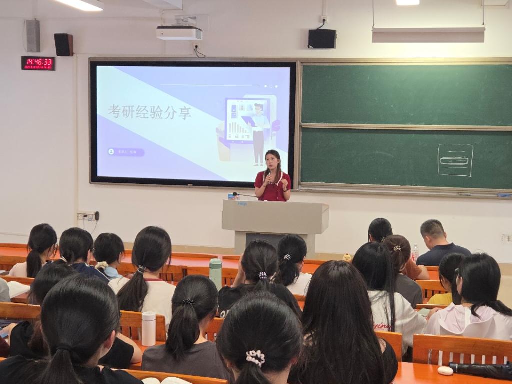 本次宣讲会还特别邀请了学院在读的优秀研究生代表任晴同学进行经验分享。任晴同学结合自身备考经历与读研体会,从目标确立、复习规划、心态调整到研究生阶段的学习科研与生活感悟,进行了真诚而细致的分享。
