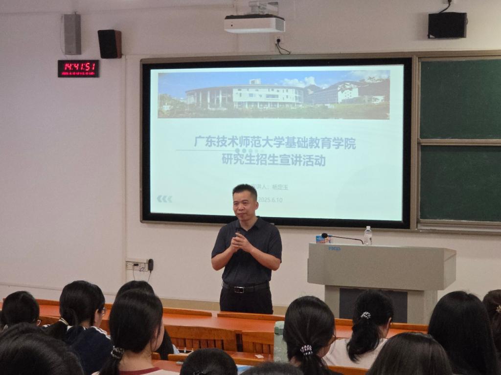 宣讲会上,杨定玉教授立足学院发展全局,对小学教育专业硕士项目的培养目标、特色优势及招生政策进行了全面而深入地阐述。他特别强调了学院的使命与担当:学院始终将“教育帮扶”作为重要责任,立足河源,紧密对接粤东西北地区基础教育发展的实际需求,致力于培养“下得去、留得住、教得好”的高素质基础教育人才。杨教授指出,本专业研究生培养将着重强化学生的实践能力、研究素养与教育情怀,使其毕业后能够精准对接区域基础教育发展痛点,成为推动地方教育优质均衡发展的生力军。最后杨教授表示了深切期许:“我们期待有志学子加入,共同扎根粤东西北沃土,用优质教育点亮更多孩子的未来。”