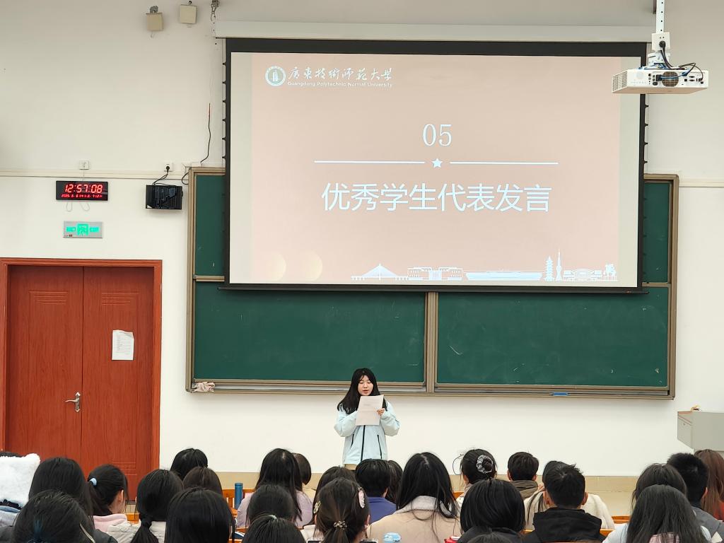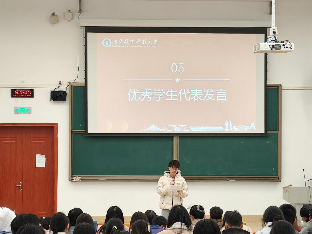 三人行,必有我师焉。想成为优秀的人,就要向优秀的人学习。此次大会,学院特表彰在德智体美劳等各领域表现优异的同学,旨在强化先进行为,发挥榜样力量,引导同学们向先进看齐,向榜样学习,保持专注,向上生长。2023级、2024级小学教育专业本科生郭南璇、张子为作为优秀学生代表发言,分享学习经验。