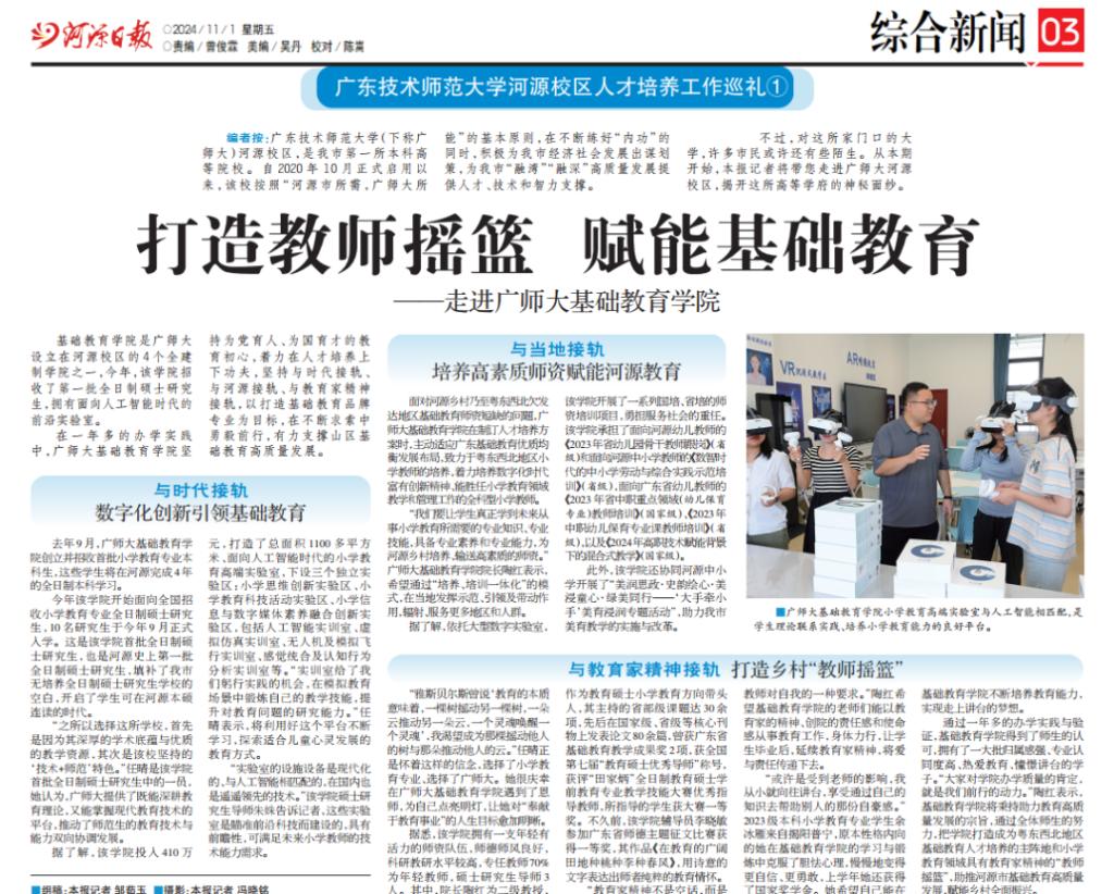 2024年11月,学院获得河源主流媒体《河源日报》深度报道,知名度、美誉度、影响力进一步提升。