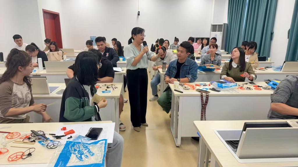 培训伊始,由中国电子学会青少年无人机技术指导教师涂明带来了题为“低空经济浪潮下中职教育的转型与突破:培养低空产业的实用型人才”的讲座,为参训教师介绍无人机领域的相关技术,并指导参训教师通过动手组装及试飞无人机来体会其魅力。