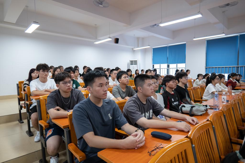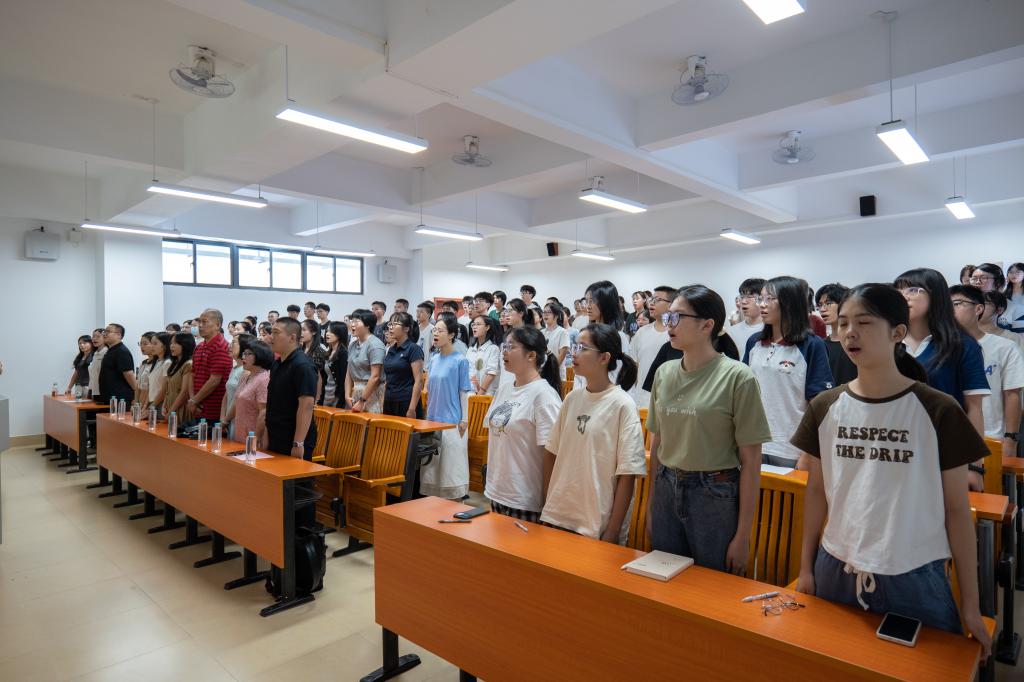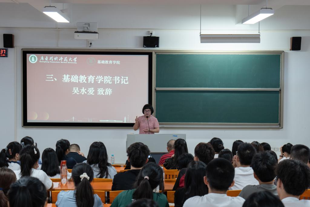 开学典礼在庄严而肃穆的中华人民共和国国歌旋律中拉开序幕。全体新生齐唱国歌,彰显新时代青年的爱国之志。“大学,不仅是知识的殿堂,更是你们锤炼品格、磨砺意志、探索未知、实现自我超越的广阔舞台。”学院吴水爱书记勉励新生志存高远,树立远大理想;志存高远,树立远大理想;修身立德,锤炼高尚品格;团结协作,共创美好未来,在广师大逐梦新征程,书写人生精彩华章。
