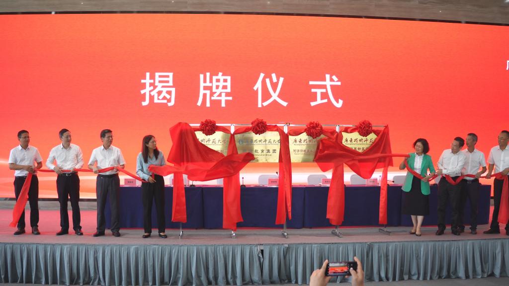 在欢快的音乐声中,谢春燕、戴青云、苏晖等领导和嘉宾共同为广师大河源教育集团和成员校揭牌。红绸缓缓落下,金色的牌匾在灯光下熠熠生辉,标志着这一教育创新平台正式启航。