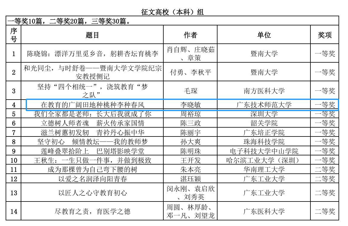 近日,广东省教育厅公示了“躬耕教坛 强国有我”为主题的第十三届师德征文及微视频征集活动的评选结果。我院推荐的作品《在教育的广阔田地种桃种李种春风》(作者:李晓敏)获得师德征文高校(本科)组一等奖。