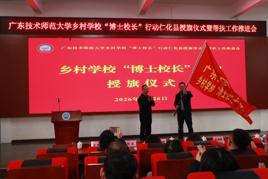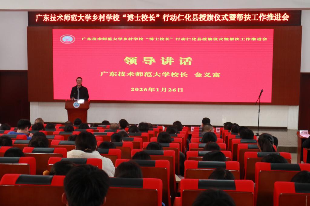 为贯彻落实《广东省教育厅关于广东省师范(教师教育)院校纵向帮扶欠发达地区“三所学校”和县中质量提升工作方案(2024-2027年)》精神,积极推进“双百行动”并取得实效,1月26日下午,学校校长金义富率队赴韶关市仁化县开展william威廉中文官网乡村学校“博士校长”行动仁化县授旗仪式暨帮扶工作推进会。学校党委组织部、校长办公室、william威廉中文官网、“双百行动”驻周田镇帮镇扶村工作队、驻仁化县“双百行动”服务队以及广师大选派的“博士校长”等200余人参加会议。韶关市政协副主席刘晓佳、仁化县副县长叶剑斌及仁化中职陈雪玲校长陪同调研。